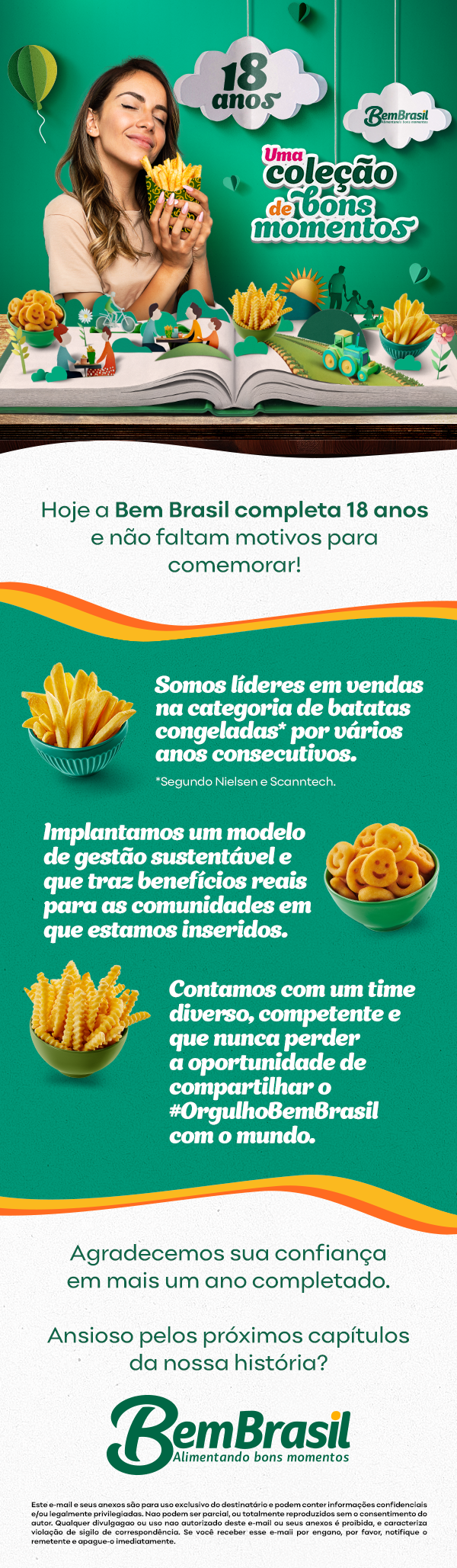 To celebrate Bem Brasil Alimentos' 18th anniversary, we created a campaign focused on the good times provided by the brand, with lots of Brazilianness and good humor. // Para celebrar os 18 anos da Bem Brasil Alimentos, criamos uma campanha focada nos bons momentos proporcionados pela marca.